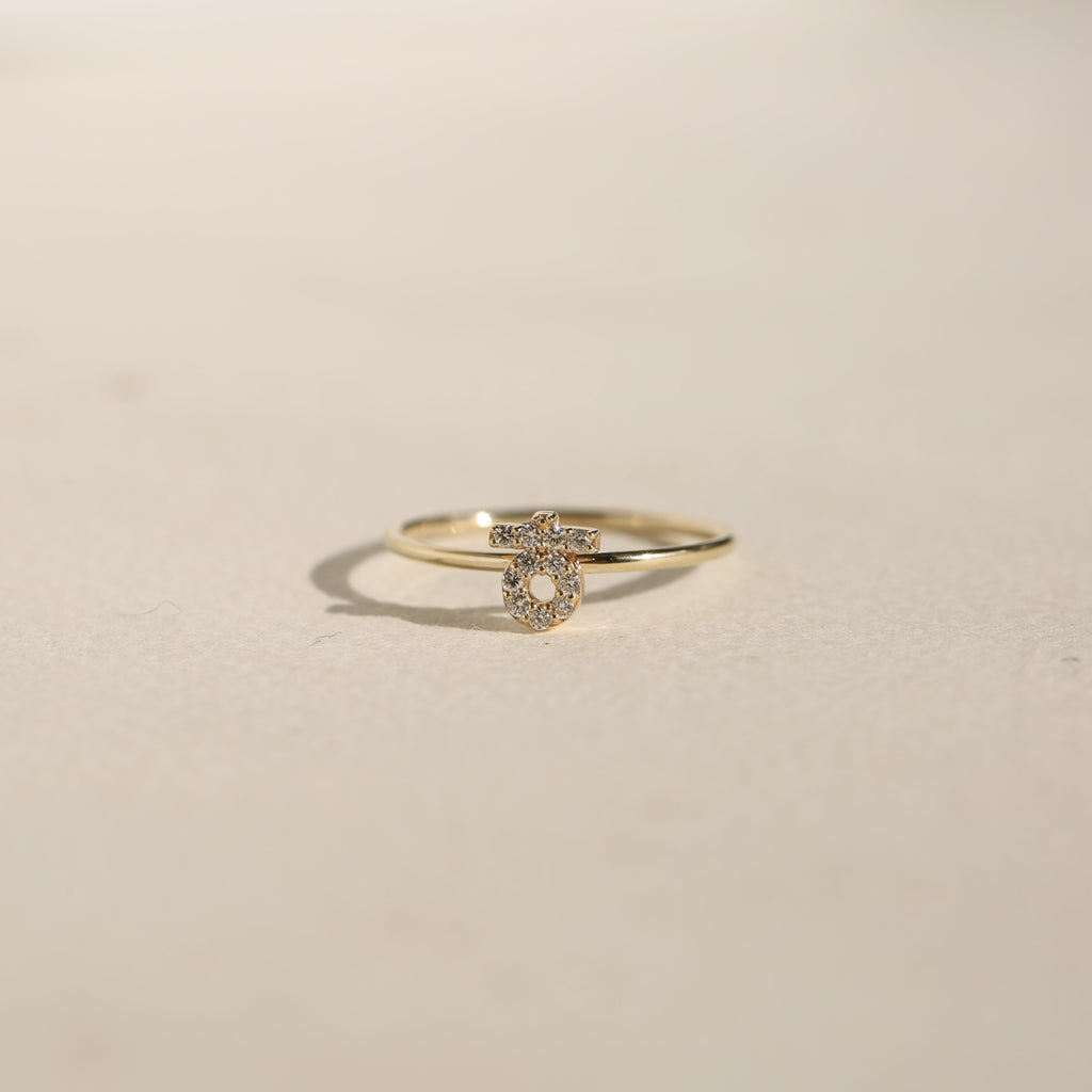 A 14-karat gold ring with one 5mm gold character with pavé diamonds.